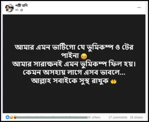 এ অভিনেত্রী লিখেছেন, ‘আমার এমন ভার্টিগো যে, ভূমিকম্পও টের পাই না। আমার সারাক্ষণই এমন ভূমিকম্প অনুভব হয়। কেমন অসহায় লাগে এসব ভাবলে…! আল্লাহ সবাইকে সুস্থ রাখুক।
