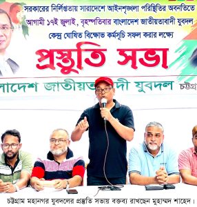 তিনি ১৫ জুলাই বিকাল ৪ টায় নাসিমন ভবনস্থ দলীয় কার্যালয় সম্মুখ মাঠে জাতীয়তাবাদী যুবদল কেন্দ্র ঘোষিত কর্মসূচির অংশ হিসেবে চট্টগ্রাম মহানগর যুবদলের উদ্যোগে আগামী ১৭ জুলাই বিক্ষোভ সমাবেশ সফল করার লক্ষ্যে প্রস্তুতি সভায় সভাপতির বক্তব্যে এ সব কথা বলেন। তিনি আরও বলেন, আমরা সরকারের উদ্দেশ্যে বলতে চাই অবিলম্বে সারাদেশে আইনের শাসন প্রতিষ্ঠা করুন। আইনশৃঙ্খলা বাহিনীকে নিরপেক্ষভাবে পরিচালনার জন্য অবিলম্বে কার্যকর ব্যবস্থা গ্রহণ করুন।