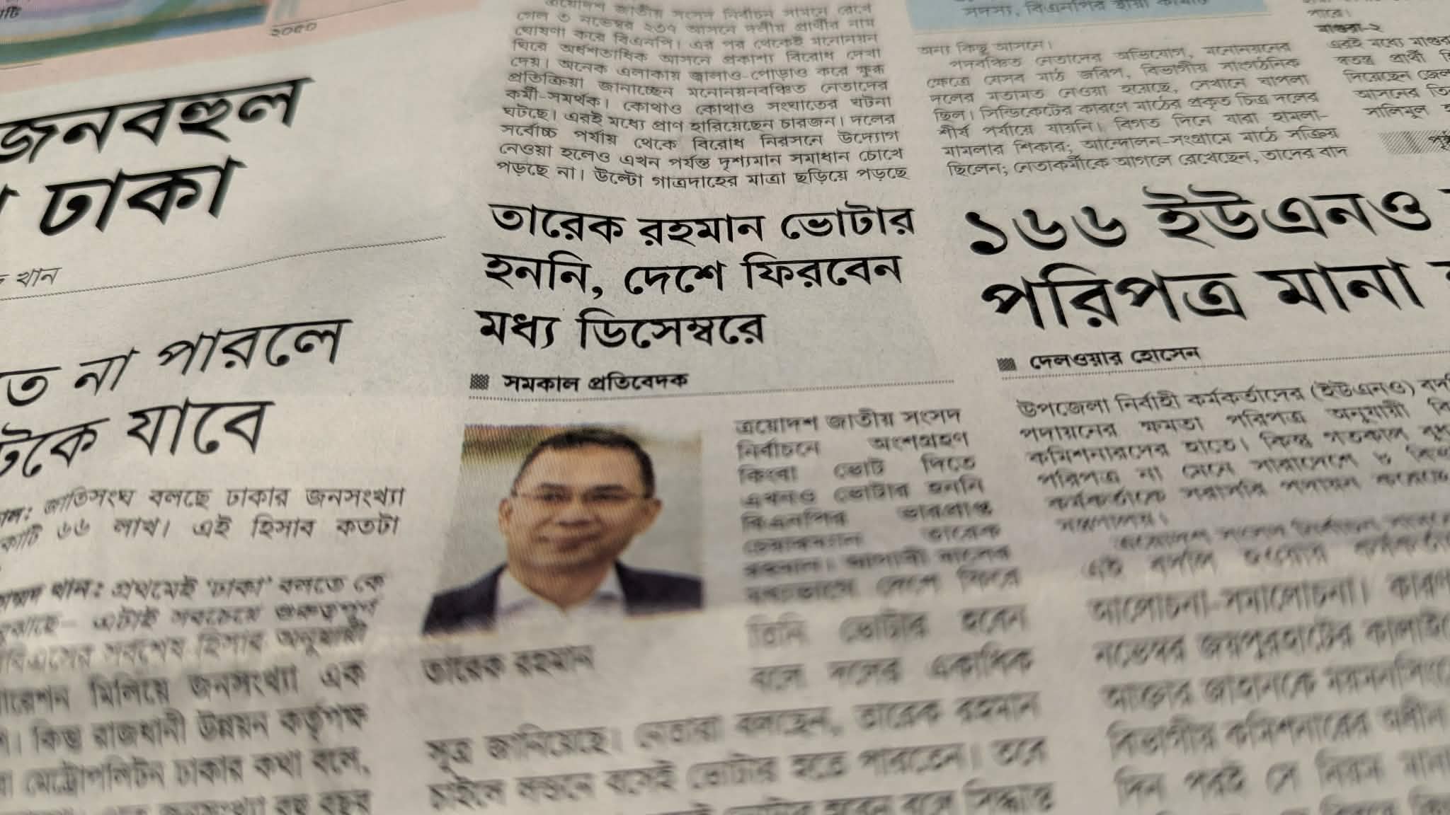 ’ভোটার হননি তারেক রহমান, ফিরবেন মধ্য ডিসেম্বরে’ — সমকালের প্রথম পাতার খবরে শিরোনাম এটি।