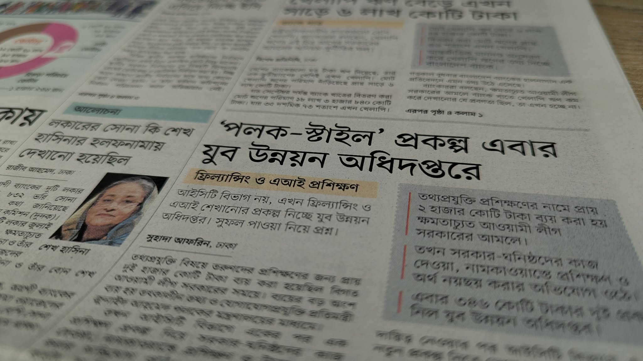 প্রথম আলোর প্রথম পাতার খবর— ‘‘ফ্রিল্যান্সিং ও এআই প্রশিক্ষণ/ ‘পলক–স্টাইল’ প্রকল্প এবার যুব উন্নয়ন অধিদপ্তরে’’