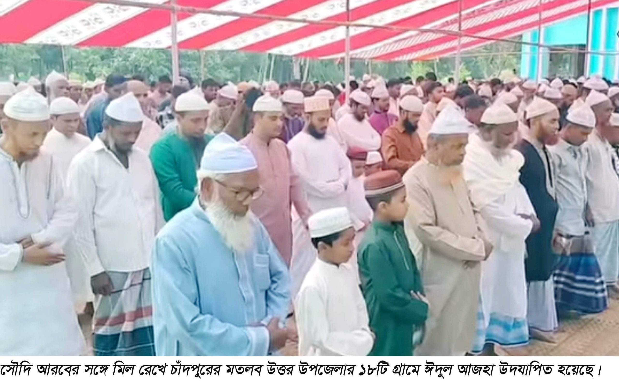 সৌদি আরবের সঙ্গে মিল রেখে চাঁদপুরের মতলব উত্তর উপজেলার ১৮টি গ্রামে ঈদুল আজহা উদযাপিত হয়েছে। এই ঈদ উদযাপন শরিক হয়েছেন