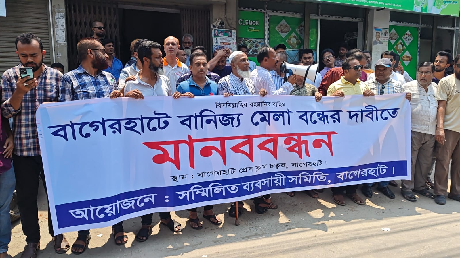বাগেরহাটে বাণিজ্য মেলা বন্ধের দাবিতে ব্যবসায়ী সমিতির বিক্ষোভ