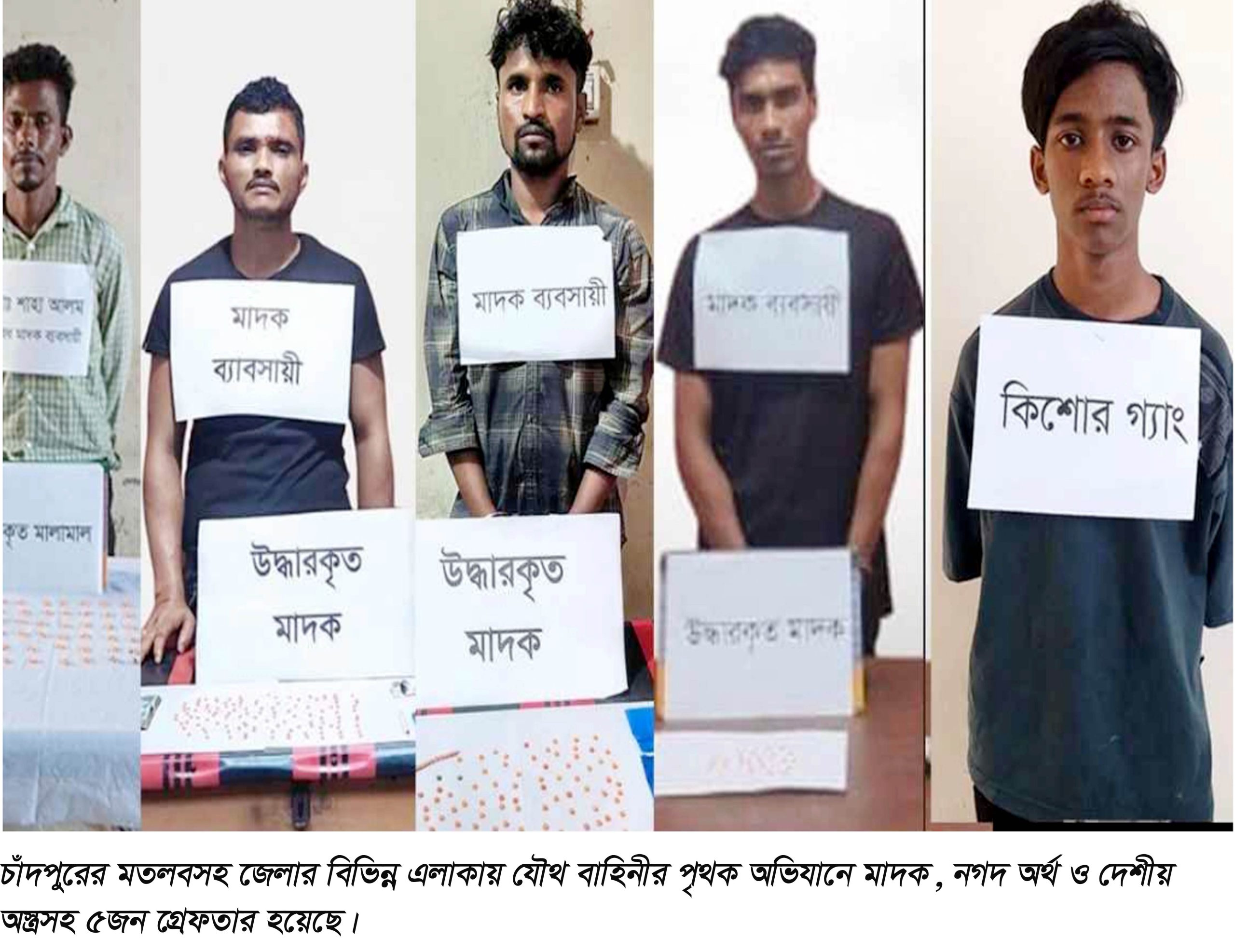 মতলব (চাঁদপুর) প্রতিনিধিঃ চাঁদপুরের মতলবসহ জেলার বিভিন্ন এলাকায় যৌথ বাহিনীর পৃথক অভিযানে মাদক, নগদ অর্থ ও দেশীয় অস্ত্রসহ ৫জন গ্রেফতার