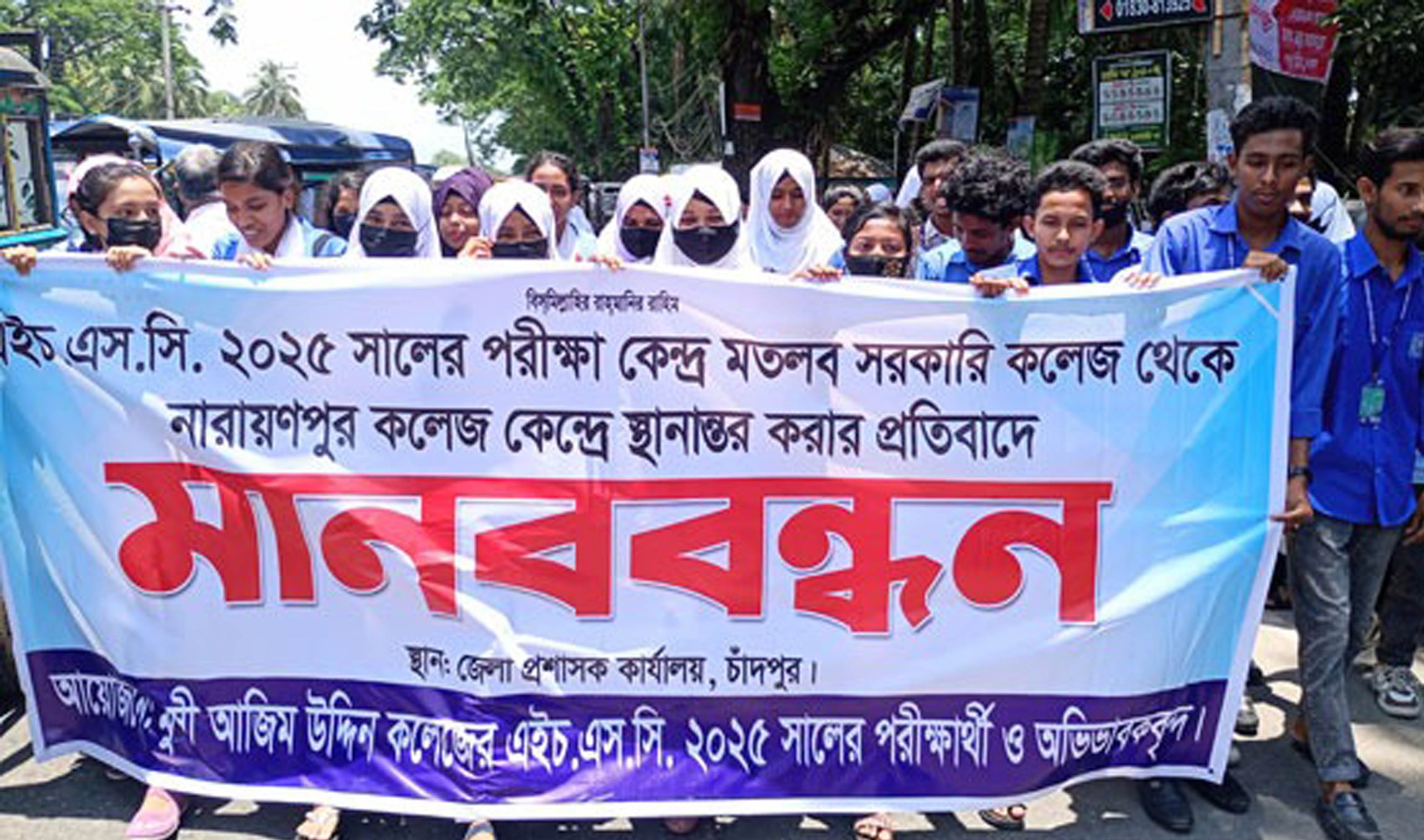 এইচএসসি পরীক্ষা কেন্দ্র পরিবর্তনের প্রতিবাদে শিক্ষার্থীদের মানববন্ধন