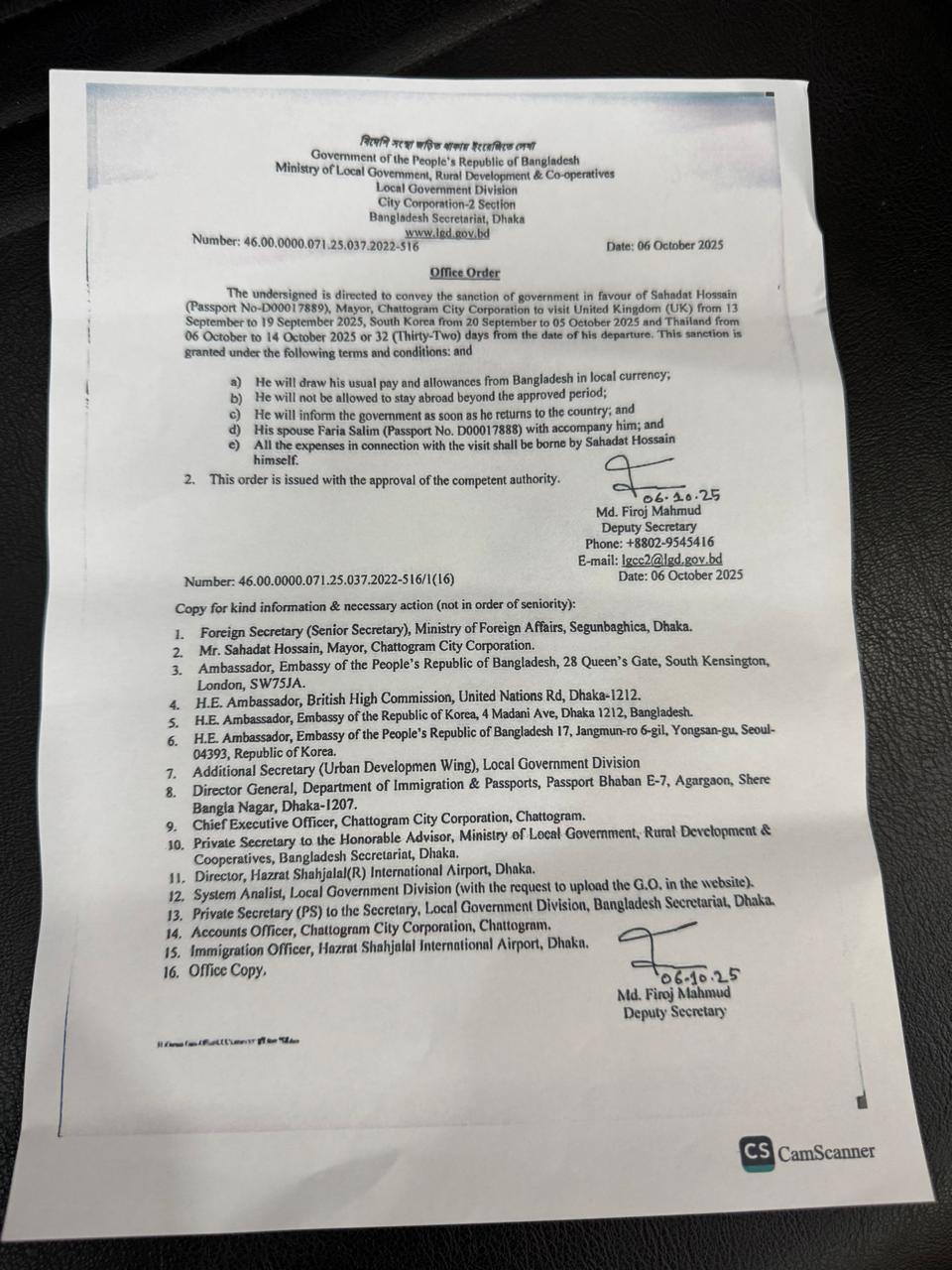 চট্টগ্রাম প্রতিনিধি চট্টগ্রাম সিটি কর্পোরেশনের মেয়র ডা. শাহাদাত হোসেনের লন্ডন সফরকালে চট্টগ্রাম সিটি কর্পোরেশনের প্রশাসনিক কার্যক্রমের তদারকি করবেন চসিকের সচিব