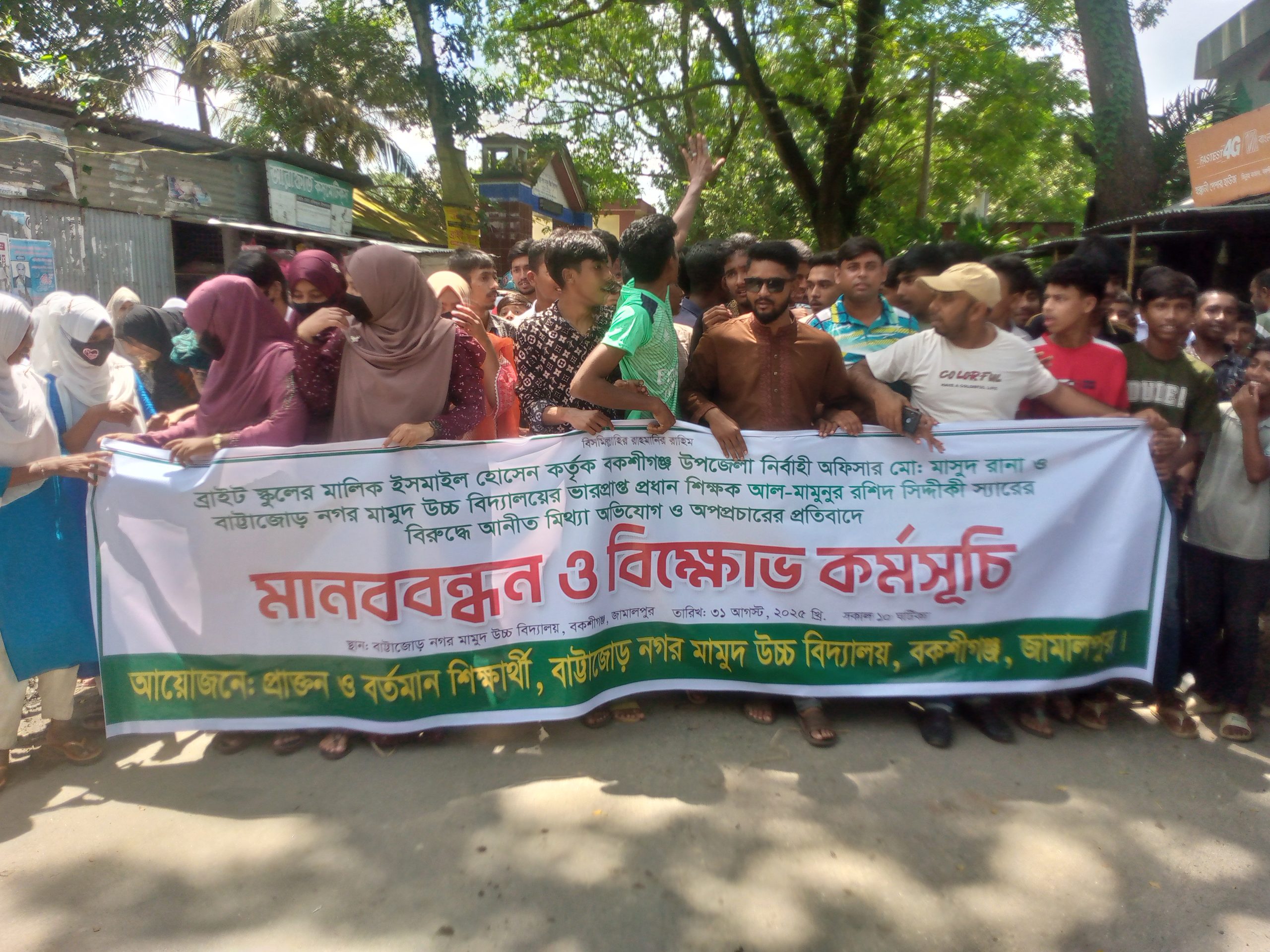 বকশীগঞ্জে সাবেক ইউএনও ও প্রধান শিক্ষকের বিরুদ্ধে অপপ্রচারের প্রতিবাদে মানববন্ধন