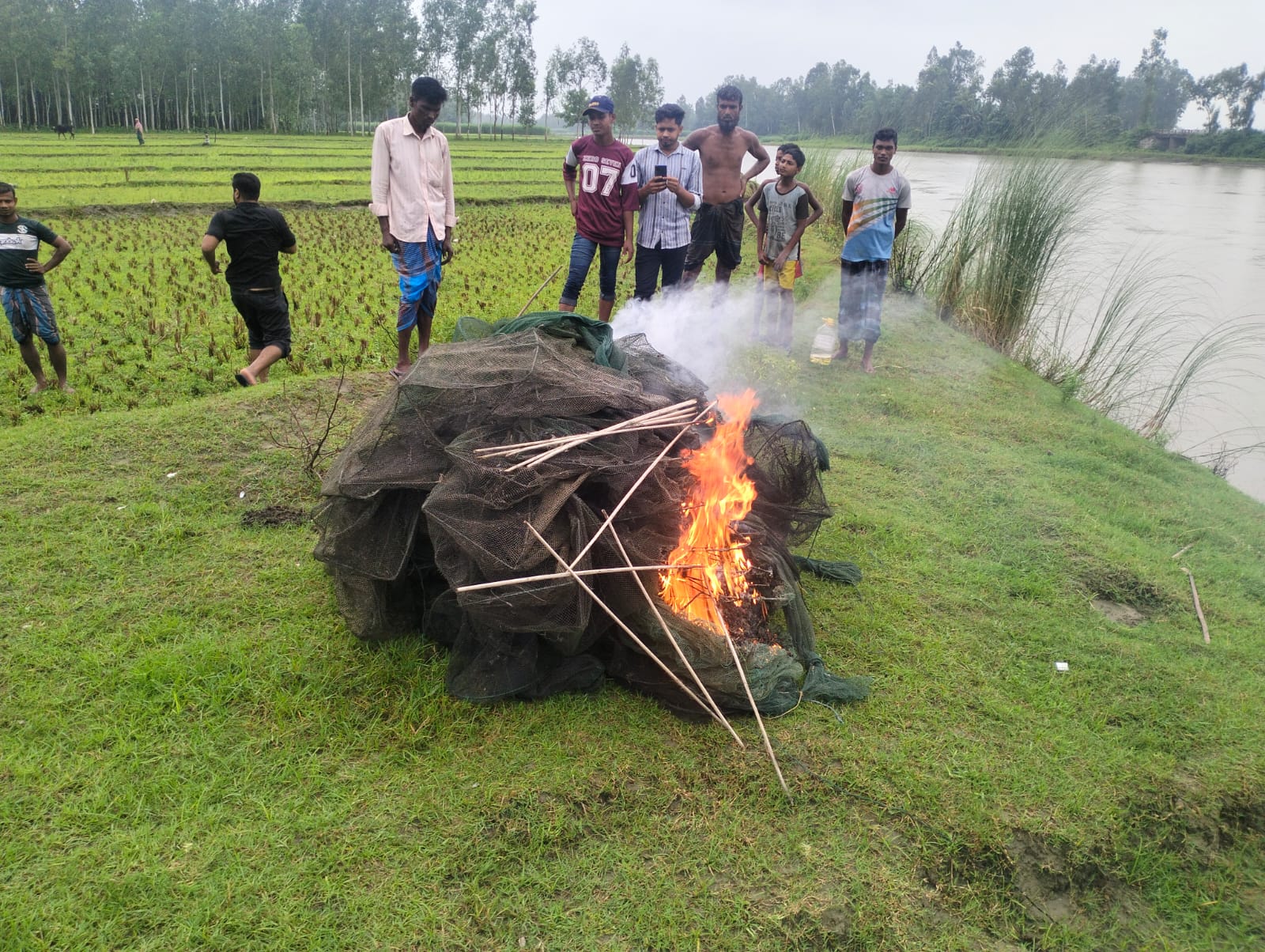 বকশীগঞ্জে অবৈধ রিং জাল পুড়িয়ে ধ্বংস