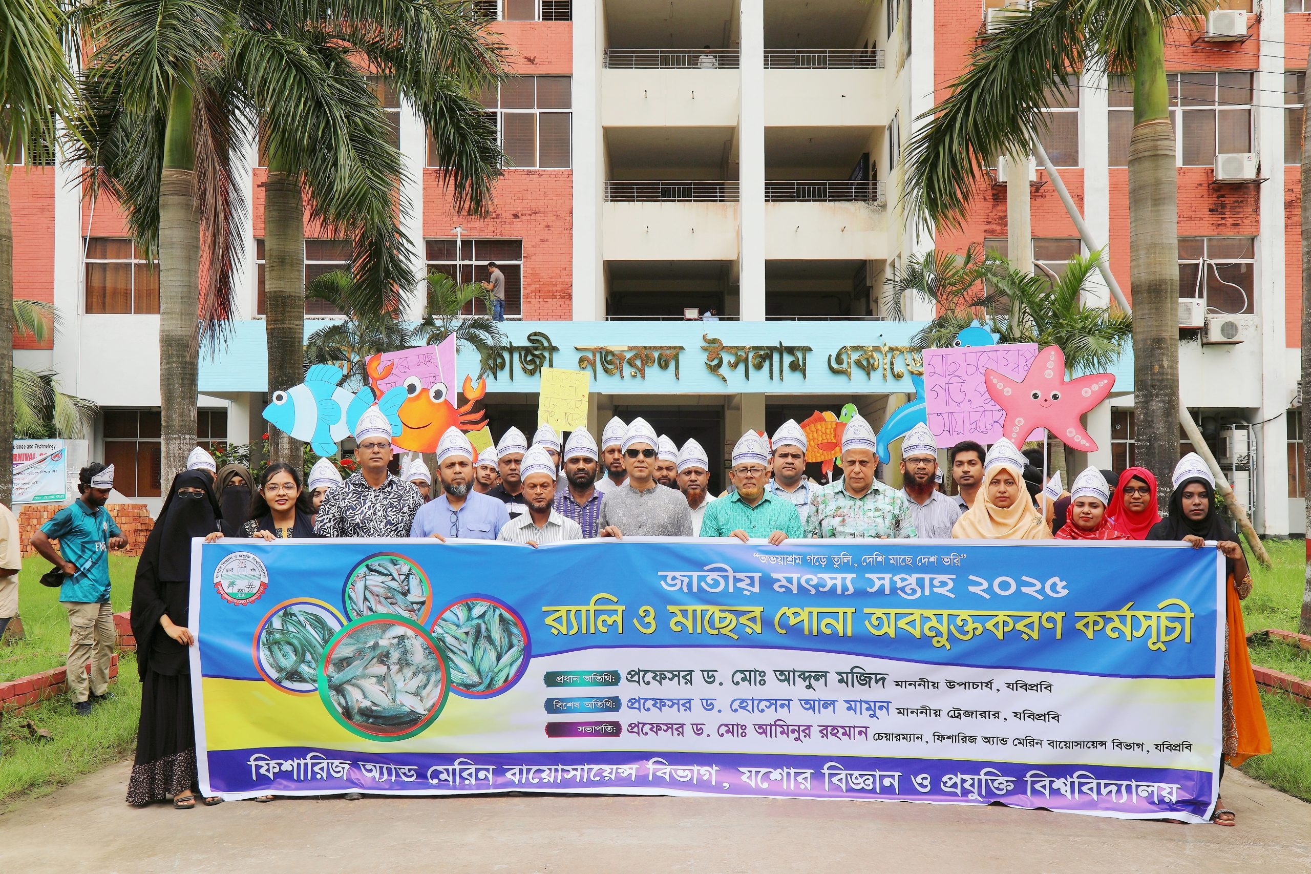 যশোর অফিস যশোর বিজ্ঞান ও প্রযুক্তি বিশ্ববিদ্যালয়ে (যবিপ্রবি) গবেষণা পুকুরে পোনা অবমুক্তকরণ, শোভাযাত্রা, সংক্ষিপ্ত আলোচনা সভাসহ নানা আয়োজনে জাতীয় মৎস্য