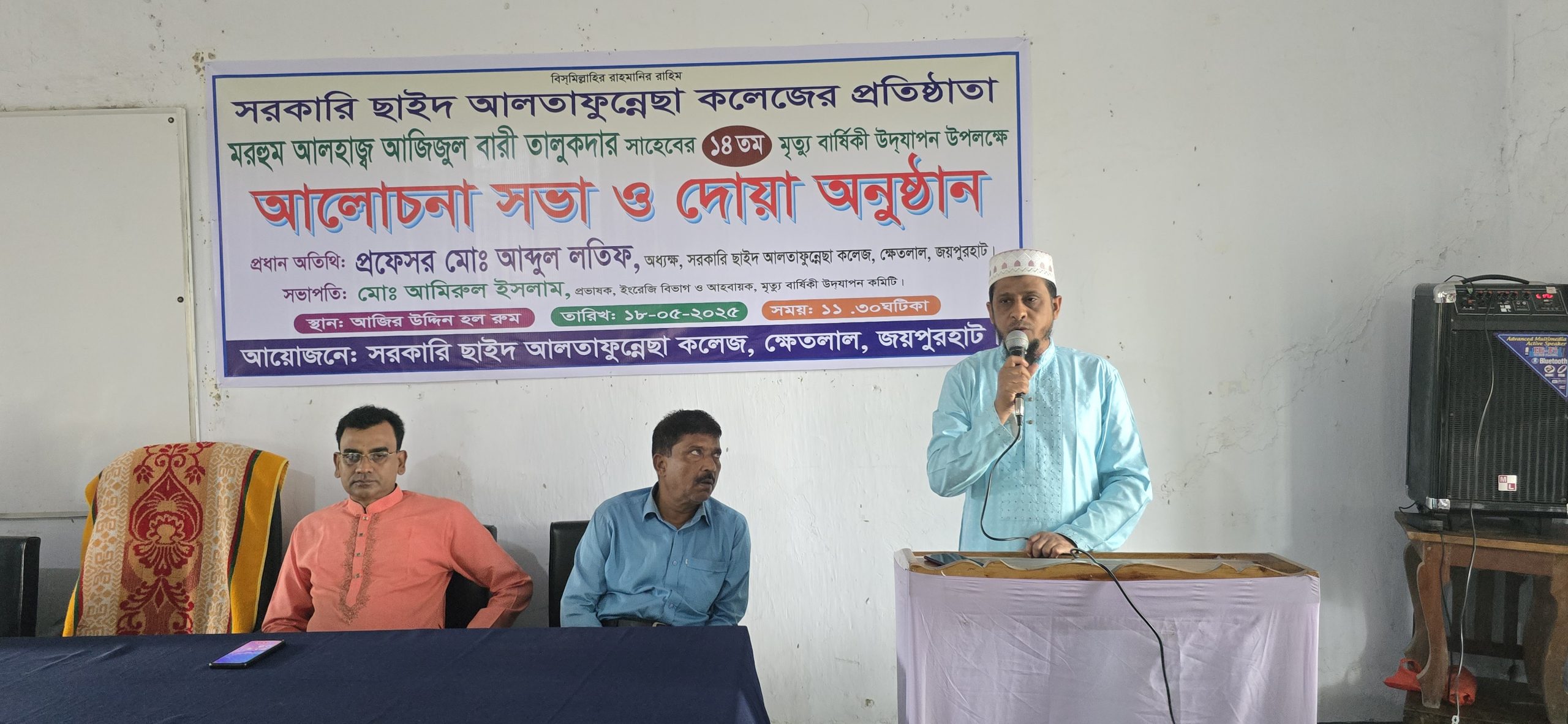 ক্ষেতলাল (জয়পুরহাট) প্রতিনিধিঃ সরকারি ছাঈদ আলতাফুন্নেছা কলেজের প্রতিষ্ঠাতা শিক্ষানুরাগী আজিজুল বারী তালুকদারের ১৪তম মৃত্যুবার্ষিকী উপলক্ষে জয়পুরহাটের ক্ষেতলালে আলোচনা সভা ও