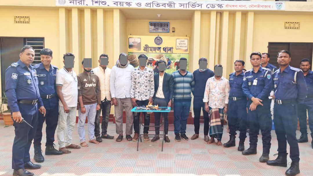 শ্রীমঙ্গলে রেস্ট হাউস থেকে সরঞ্জামসহ ৯ জুয়াড়ি আটক