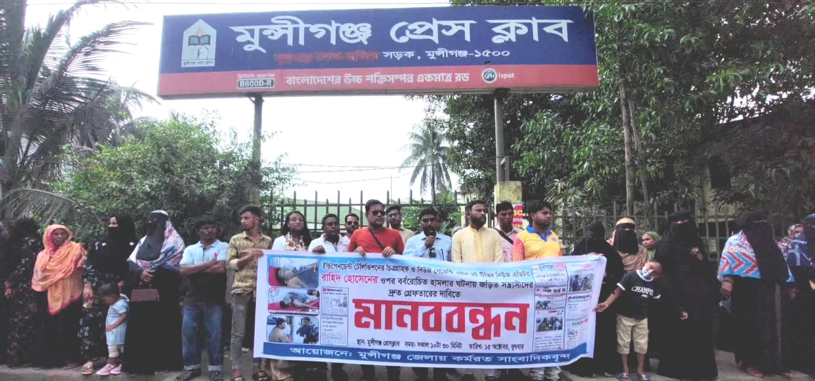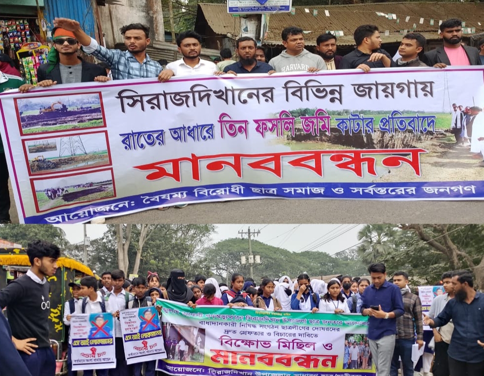 সিরাজদিখানে জমির মাটি কাটা বন্ধে ও নিষিদ্ধ ছাত্রলীগের গ্রেপ্তারের দাবিতে মানববন্ধন