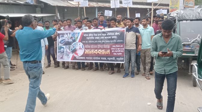 কালিয়ায় অবৈধ ঘাতক ট্রলী চলাচল বন্ধের দাবিতে মানববন্ধন
