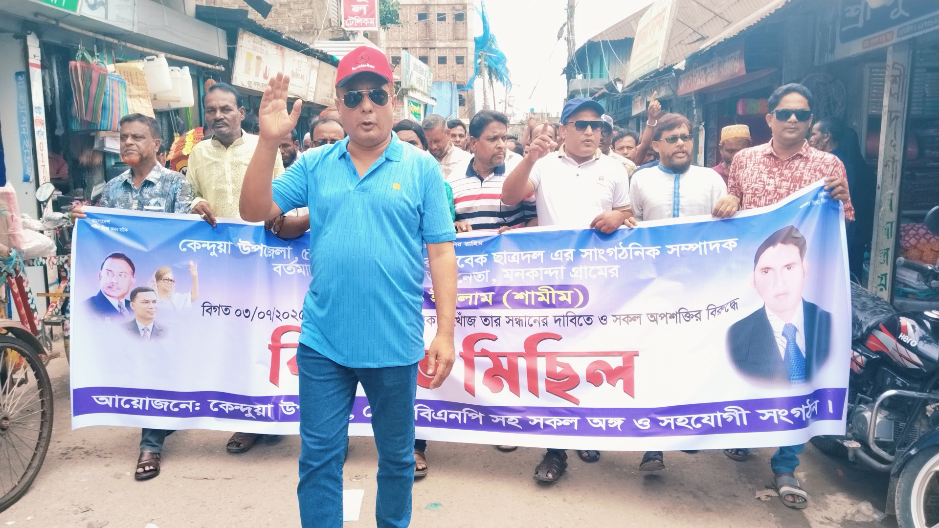 নিখোঁজ যুবদল নেতার সন্ধানের দাবিতে ও সকল অপশক্তির বিরুদ্ধে কেন্দুয়ায় বিক্ষোভ মিছিল