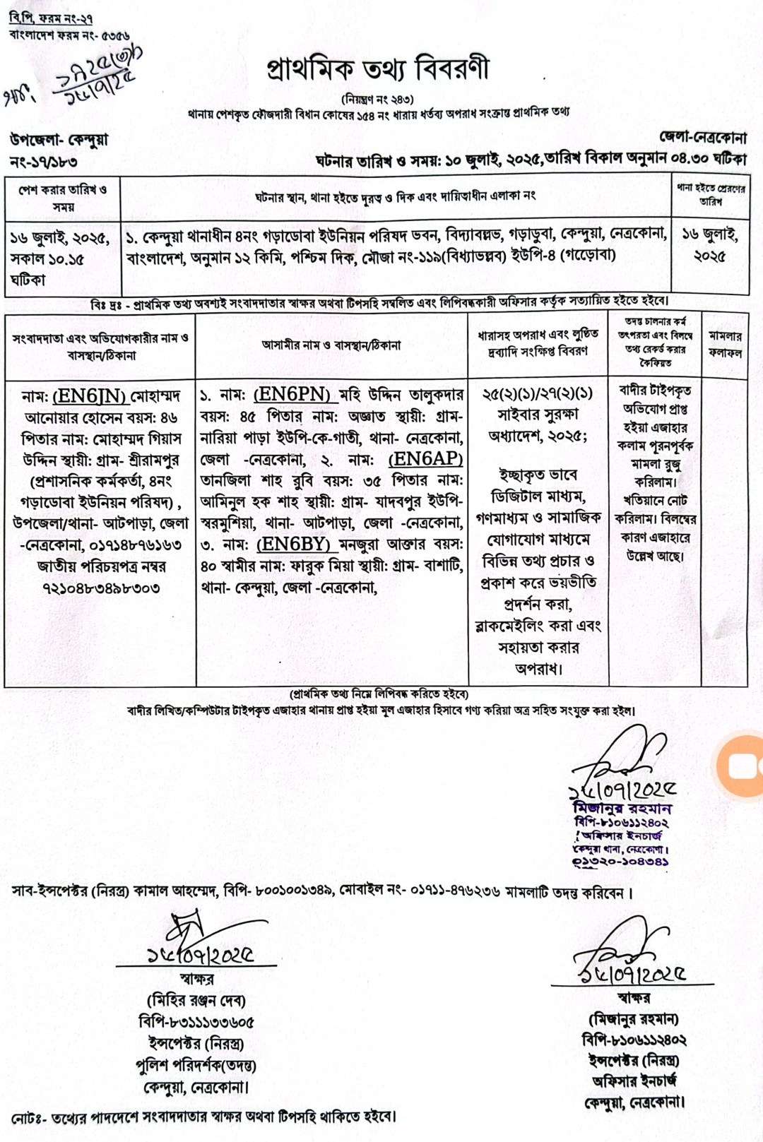 কেন্দুয়ায় তিনজনের বিরুদ্ধে সাইবার সুরক্ষা আইনে মামলা
