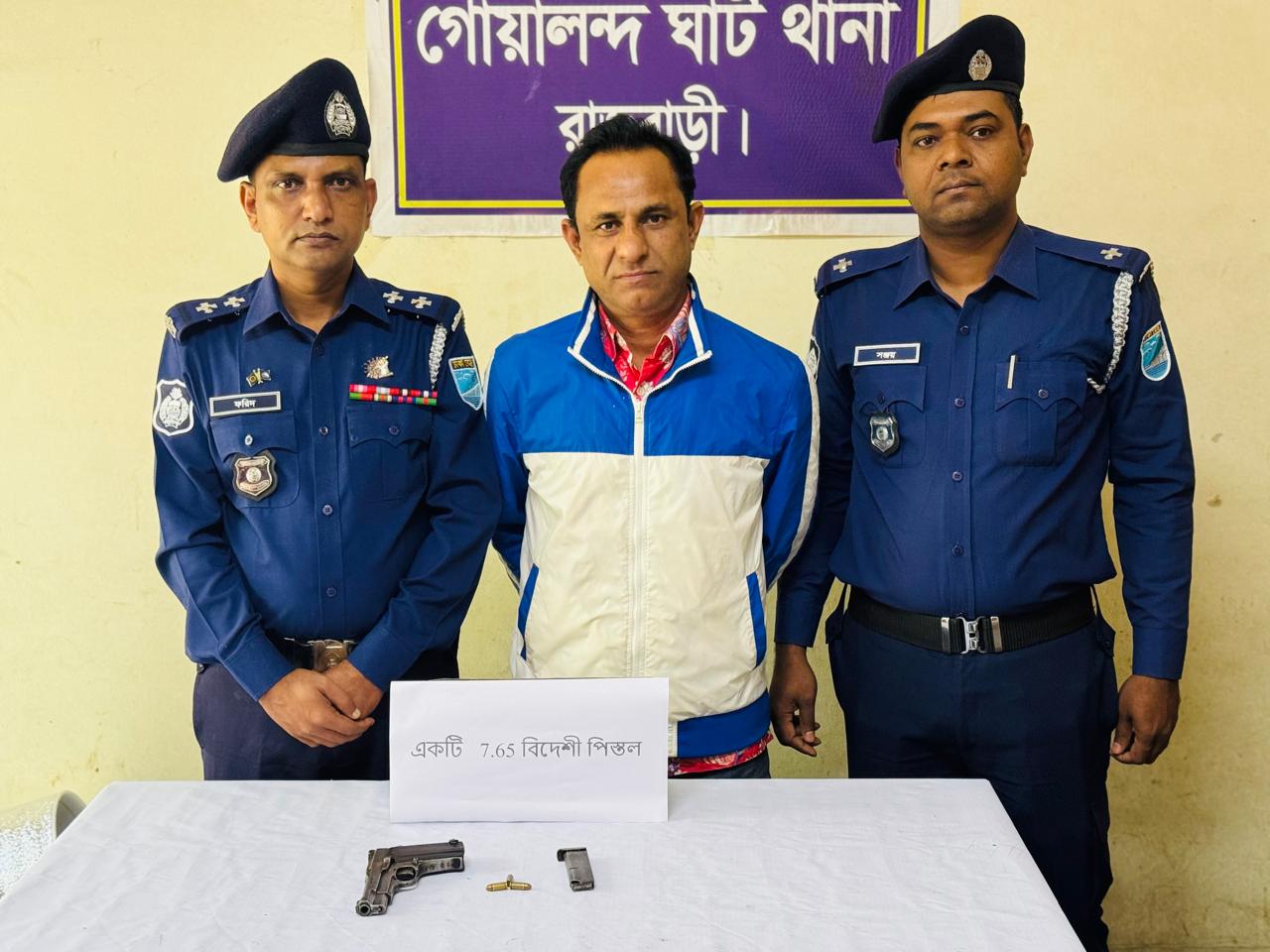 রাজবাড়ী প্রতিনিধি দেশের বৃহত্তম যৌনপল্লি রাজবাড়ীর গোয়ালন্দ উপজেলার দৌলতদিয়া যৌনপল্লি থেকে একটি বিদেশি পিস্তল ও গুলিসহ মোঃ আবুল হাসেম সুজন (৫০)
