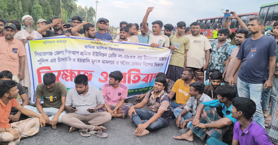 সিরাজগঞ্জে পুলিশের চাঁদাবাজি বন্ধের দাবিতে মহাসড়ক অবরোধ