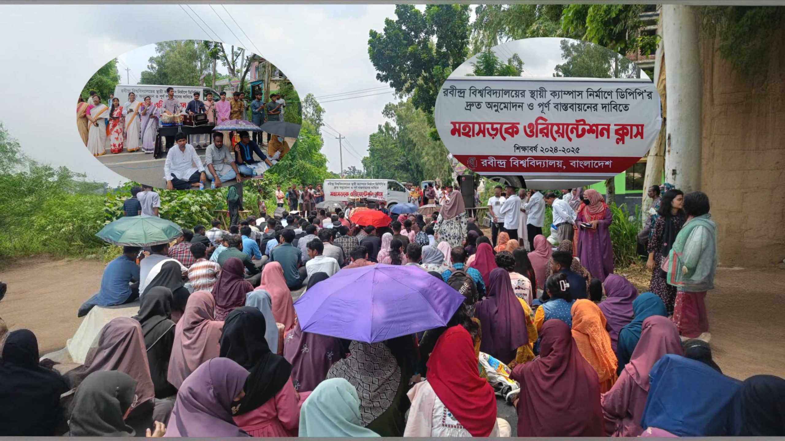 স্থায়ী ক্যাম্পাস দাবিতে মহাসড়কে রবীন্দ্র বিশ্ববিদ্যালয়ের নবীনবরণ