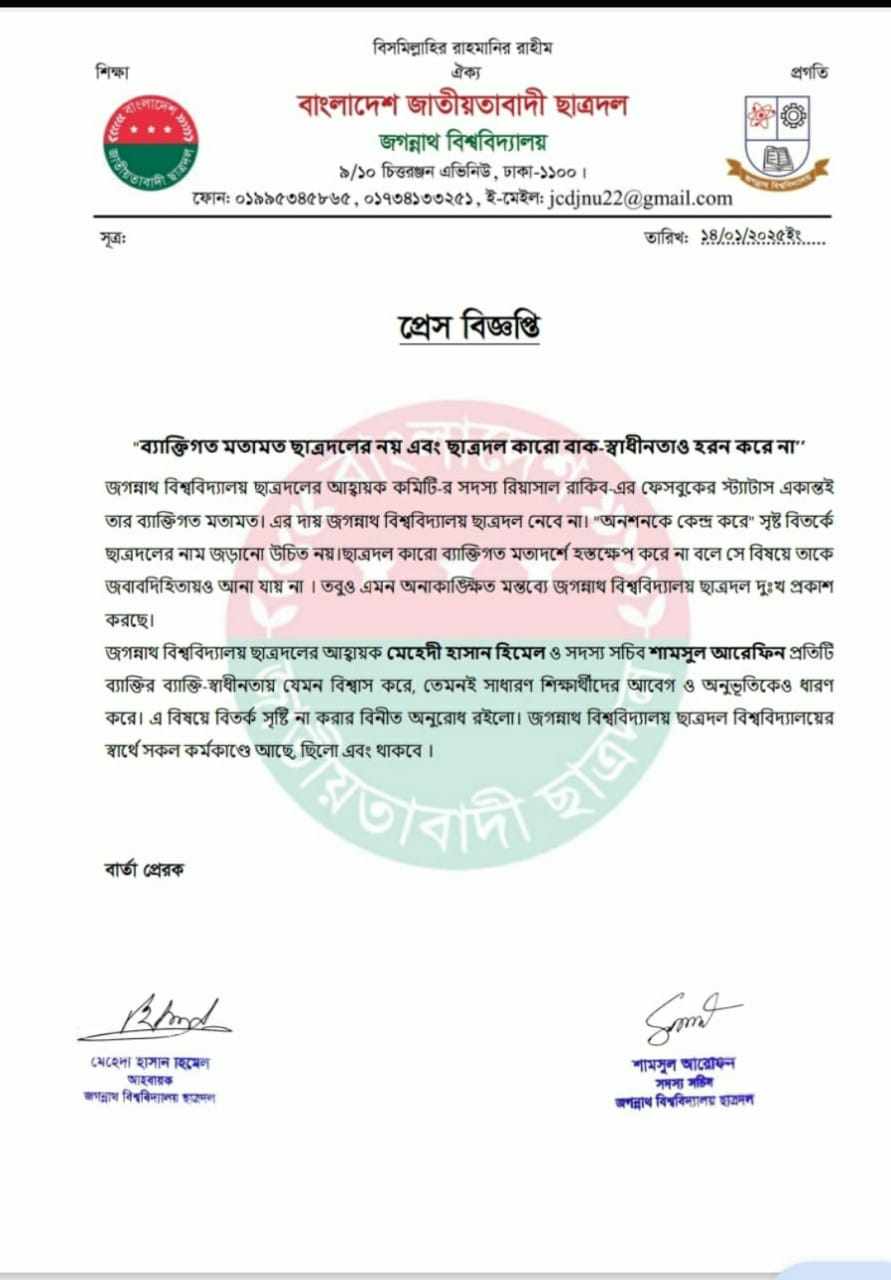 ব্যক্তিগত মতামত ছাত্রদলের নয়