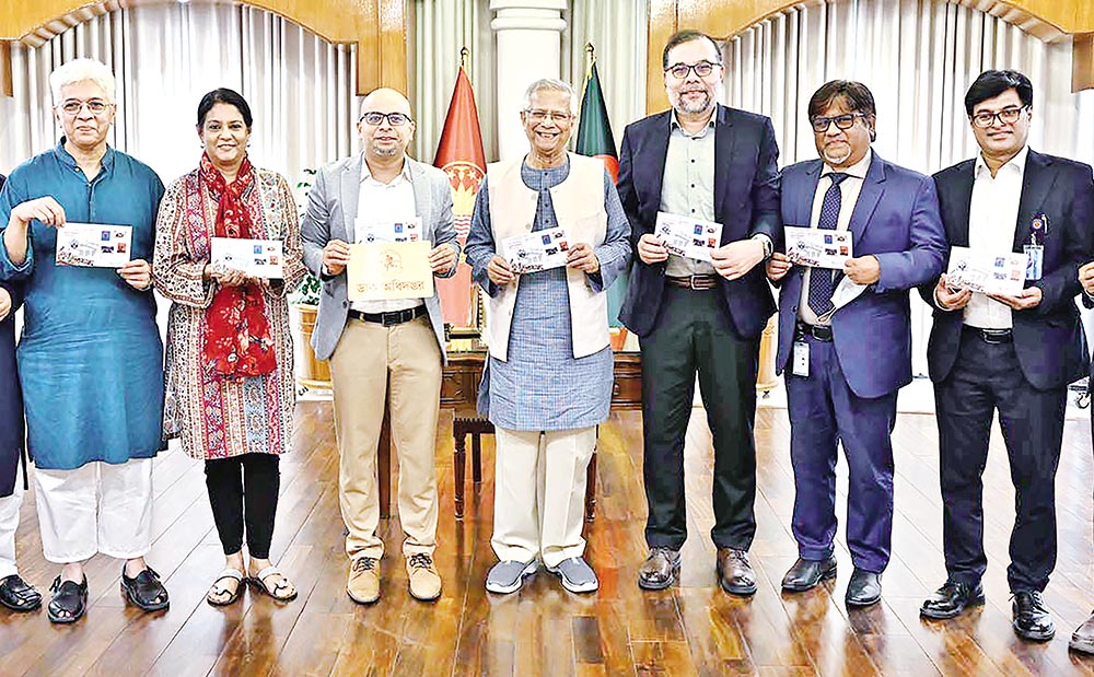 Chief Adviser Dr Muhammad Yunus on Tuesday unveiled a commemorative postage stamp, inaugural envelope and seal on the occasion of